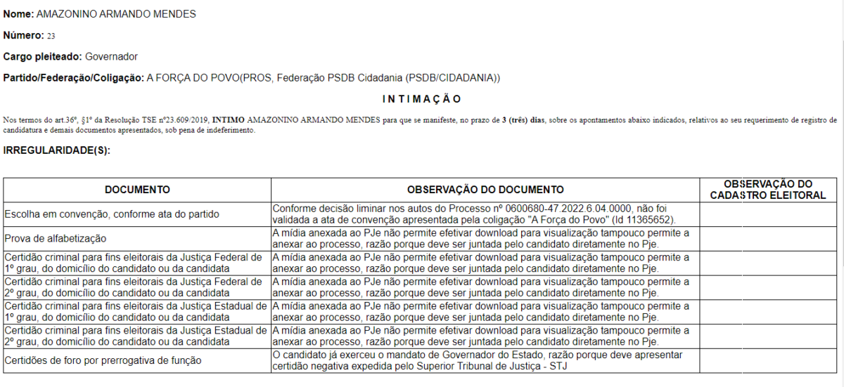 De acordo com a intimação, divulgada no site do TRE-AM, o candidato precisa comprovar uma série de irregularidades encontradas como: a escolha de seu nome em convenção, conforme ata do partido; prova de alfabetização; certidão criminal para fins eleitorais da Justiça Federal de 1º e 2 grau, do domicílio do candidato, pois as mídias anexadas ao PJe não permite efetivar download; e certidões de foro por prerrogativa de função pois o candidato já exerceu o mandato de Governador do Estado, razão porque deve apresentar certidão negativa expedida pelo Superior Tribunal de Justiça – STJ.