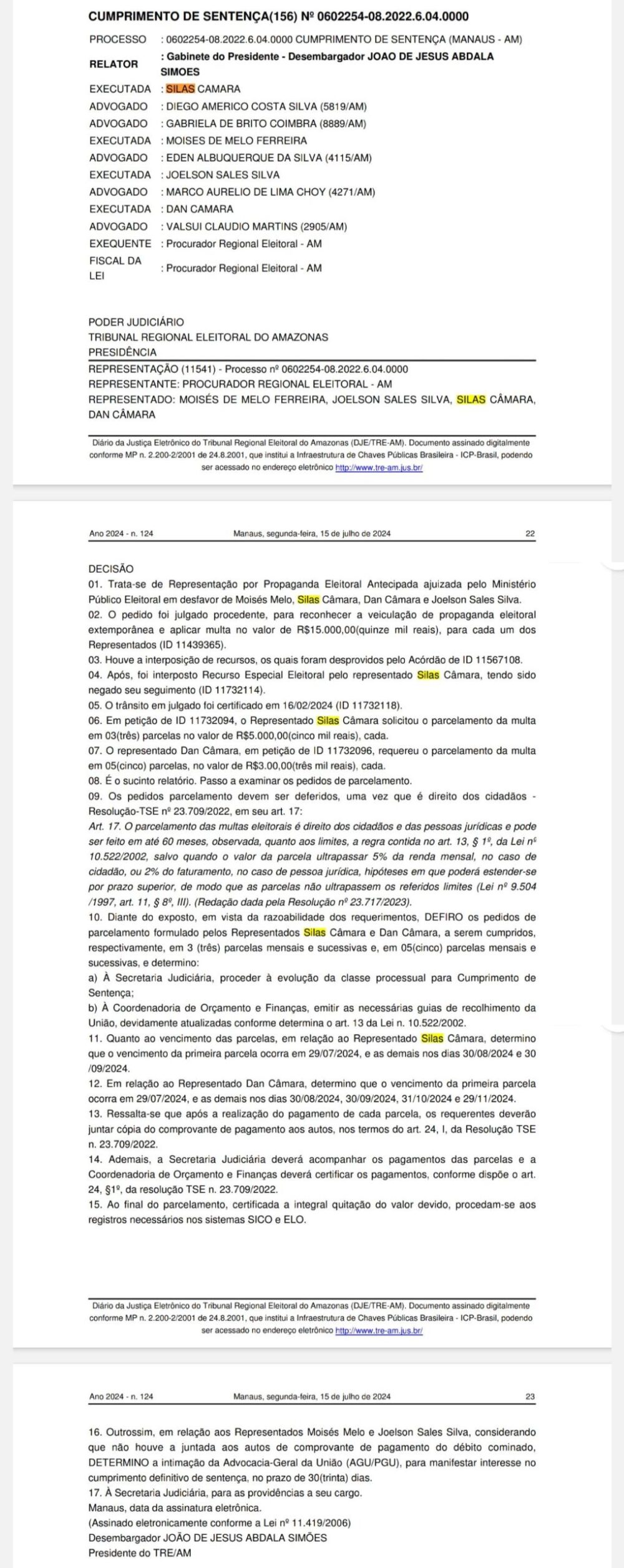 De acordo com o processo, Silas Câmara solicitou o parcelamento da multa em três parcelas de R$ 5 mil, pedido que foi acatado pelo TRE-AM. O pagamento da primeira parcela está marcado para o dia 29 de julho, com as demais parcelas vencendo em 30 de agosto e 30 de setembro.