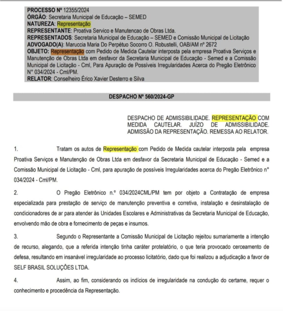 A representação inclui um pedido de Medida Cautelar contra a Secretaria Municipal de Educação (Semed), com o intuito de investigar possíveis irregularidades relacionadas ao Pregão Eletrônico n° 034/2024 – CML/PM.