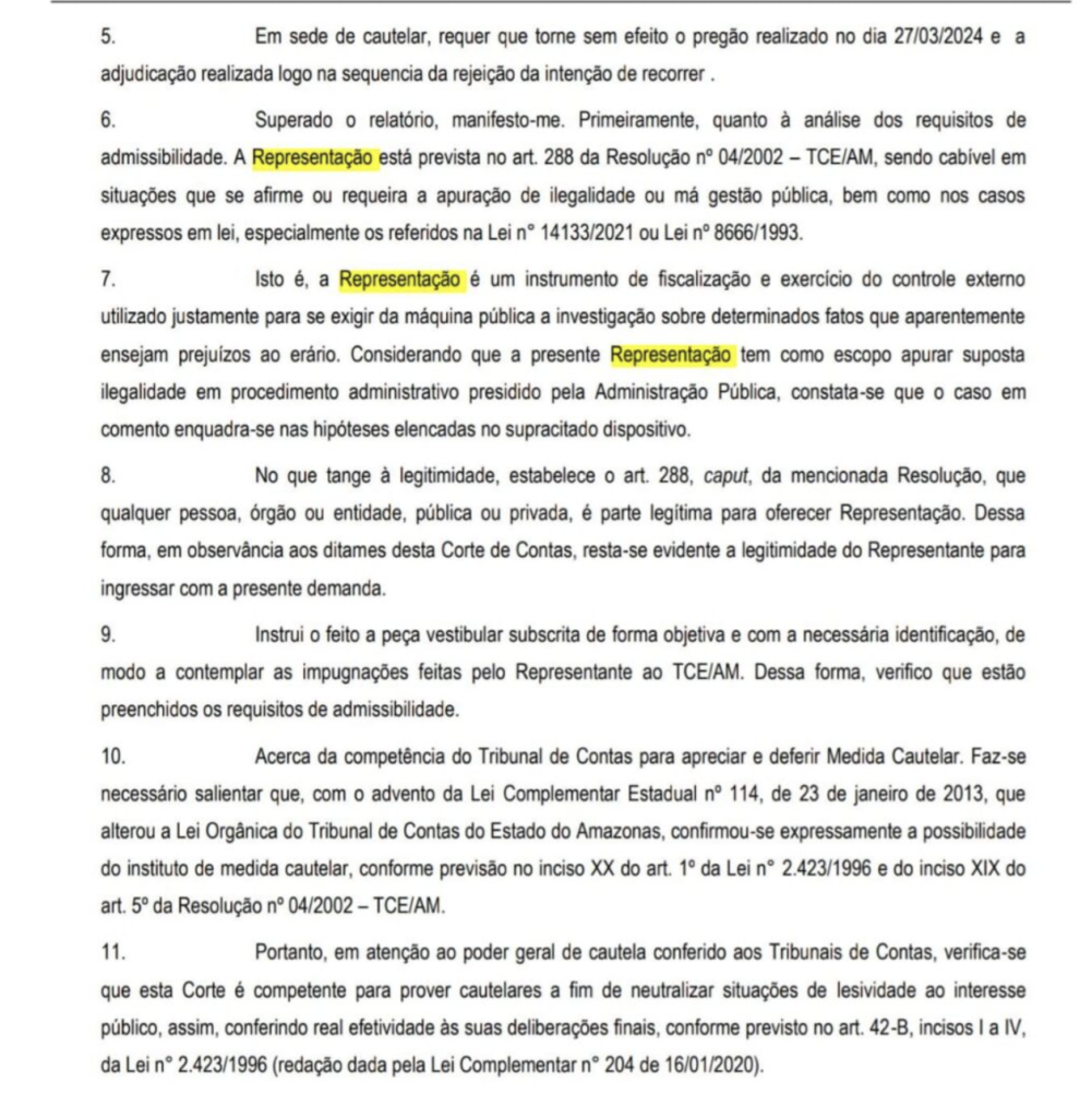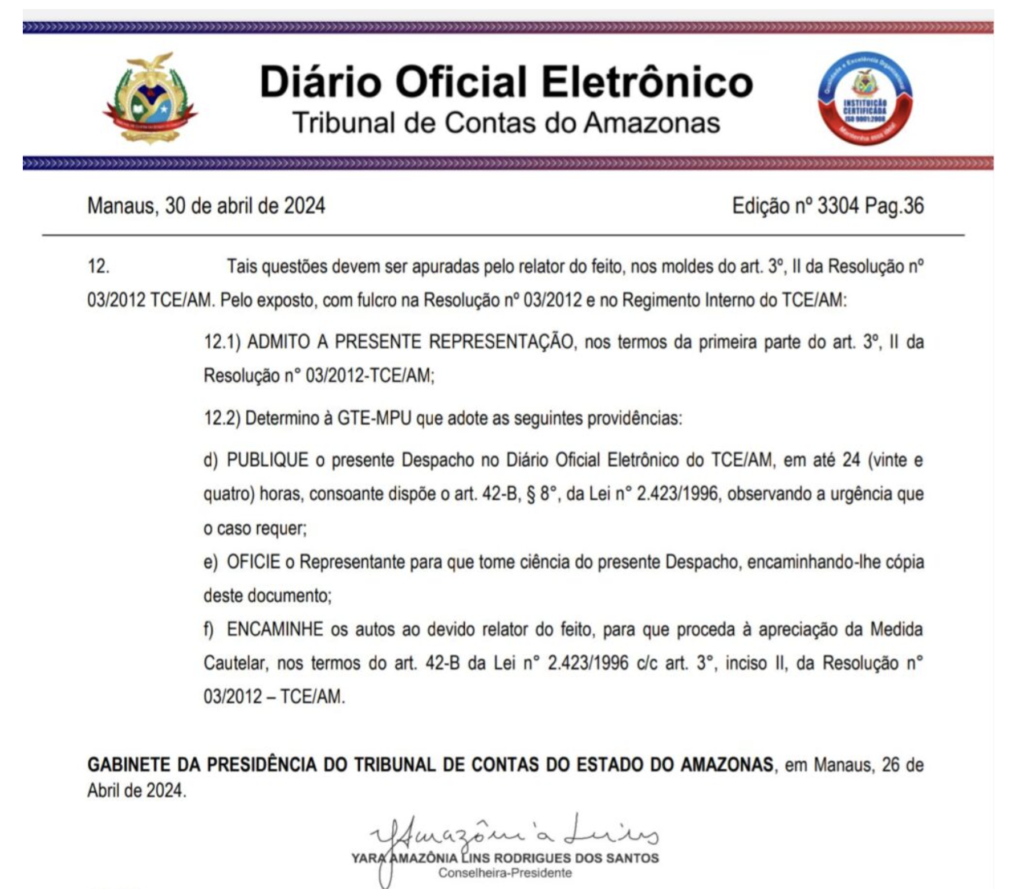 Amazonas – O Tribunal de Contas do Estado do Amazonas (TCE-AM) acatou, por meio do Processo n° 12355/2024, uma Representação apresentada pela empresa Proativa Serviço e Manutenção de Obras Ltda.