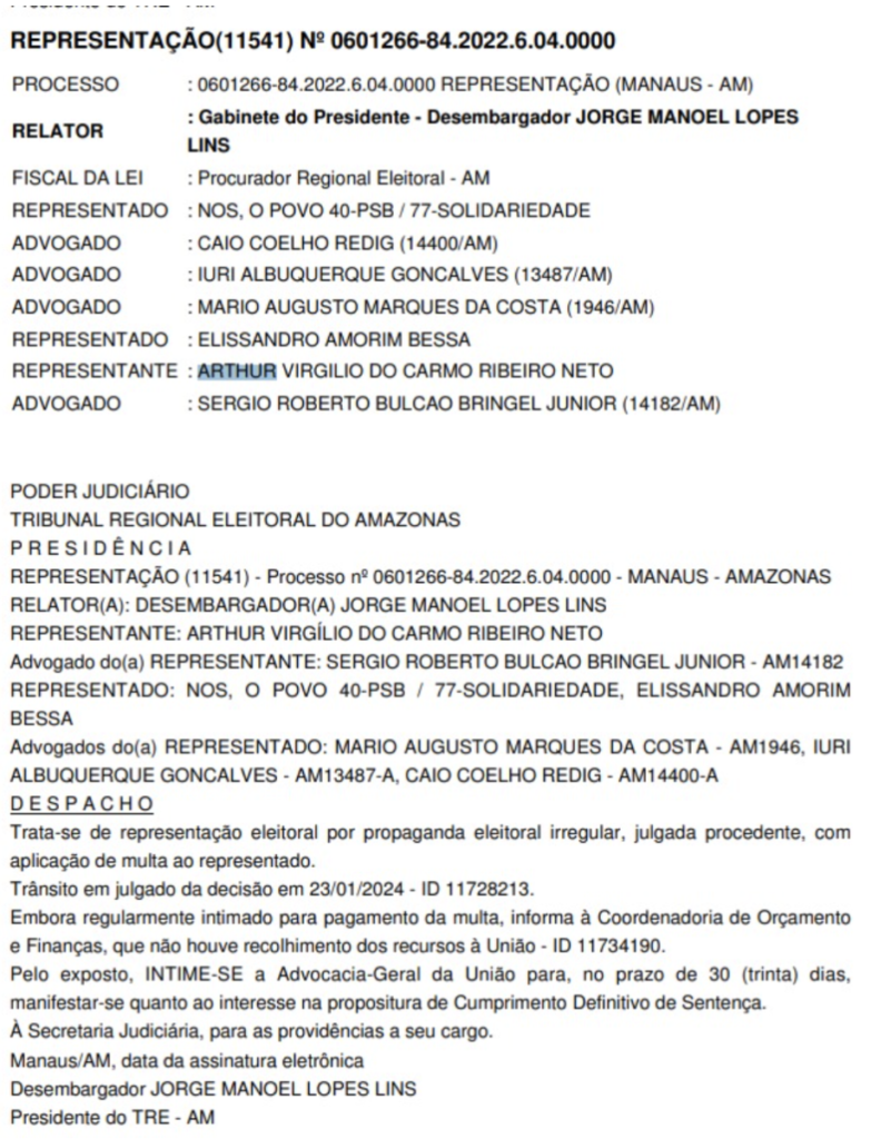 Segundo as deliberações do TRE-AM, a representação eleitoral foi julgada procedente, culminando na imposição de sanções financeiras a Arthur Neto. No entanto, apesar da regulamentação para o pagamento da multa, a Coordenadoria de Orçamento e Finanças informou que não houve o recolhimento dos recursos à União.