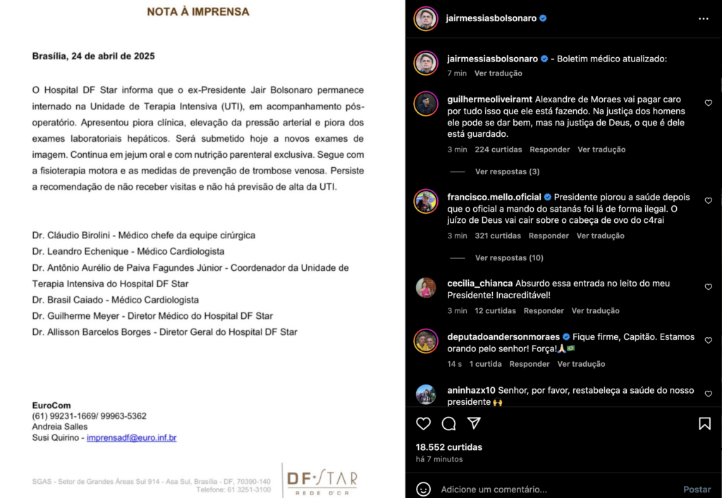 “O Hospital DF Star informa que o ex-Presidente Jair Bolsonaro permanece internado na Unidade de Terapia Intensiva (UTI), em acompanhamento pós-operatório. Apresentou piora clínica, elevação da pressão arterial e piora dos exames laboratoriais hepáticos. Será submetido hoje a novos exames de imagem.
