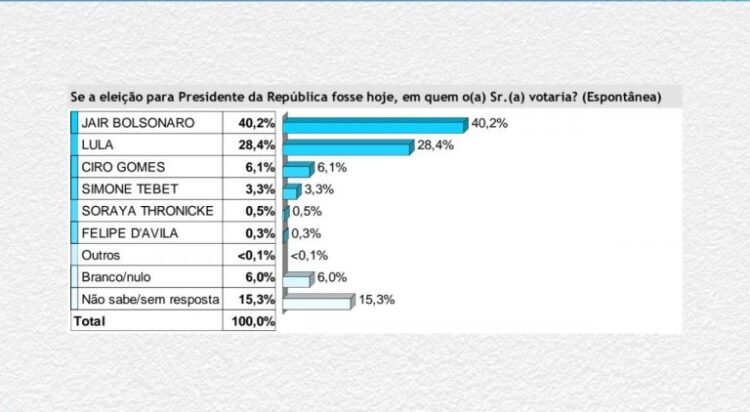 No levantamento espontâneo, Bolsonaro lidera com 40,2%, enquanto Lula aparece com 28,4%. Na soma dos votos válidos, contando com os demais candidatos, o executivo federal ainda é a maioria e consegue se eleger já no próximo dia 2 de outubro.