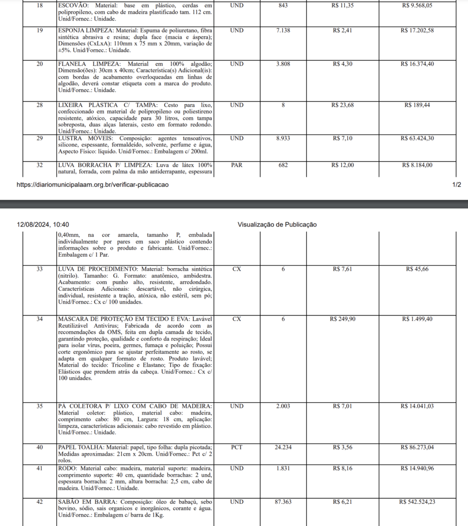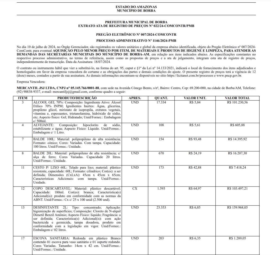 Amazonas – A Prefeitura de Borba, sob a gestão do prefeito Simão Peixoto, anunciou a compra de R$ 1,3 milhão em materiais de limpeza. O Pregão Eletrônico nº 007/2024, publicado na edição dessa segunda-feira (12), do diário da Associação Amazonense de Municípios (AAM), destaca que mais de R$ 542,5 mil serão destinados apenas à aquisição de sabão em barra.