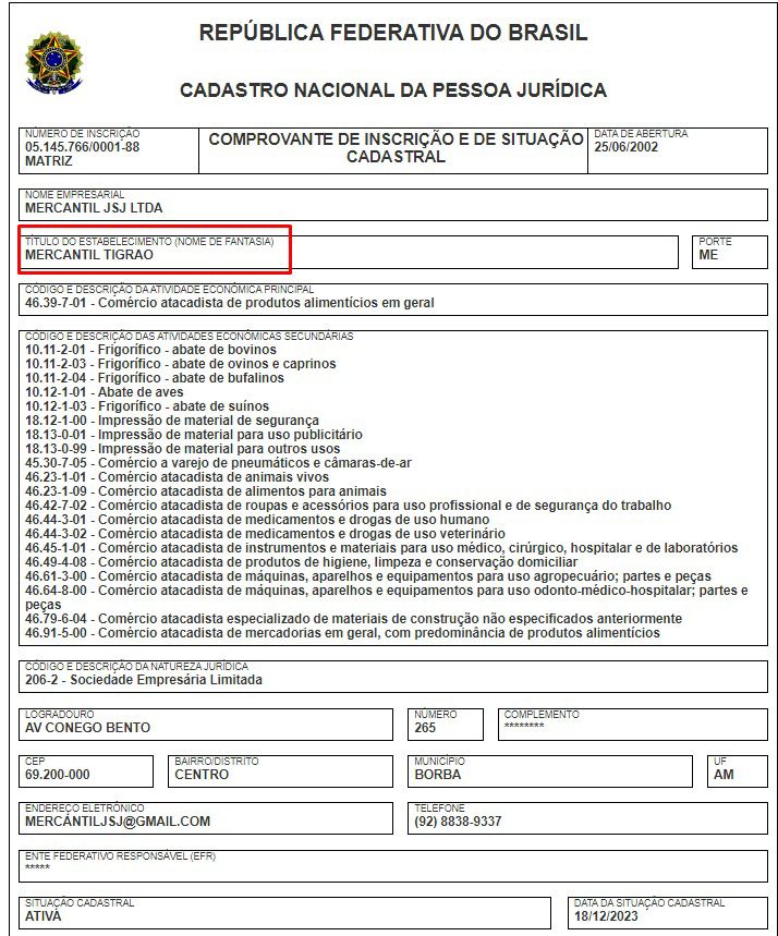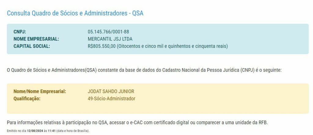 A Mercantil JSJ LTDA, de nome fantasia Mercantil Tigrão, sob o CNPJ n.º 05.145.766/0001-88, foi a ganhadora da licitação. No comprovante de inscrição e de situação cadastral, a empresa, que tem como sócio-administrador Jodat Sahdo Júnior, possui como atividade econômica principal o “comércio atacadista de produtos alimentícios em geral”.