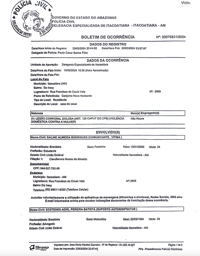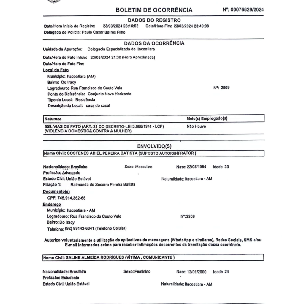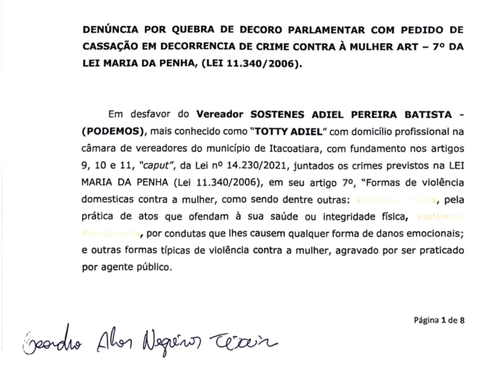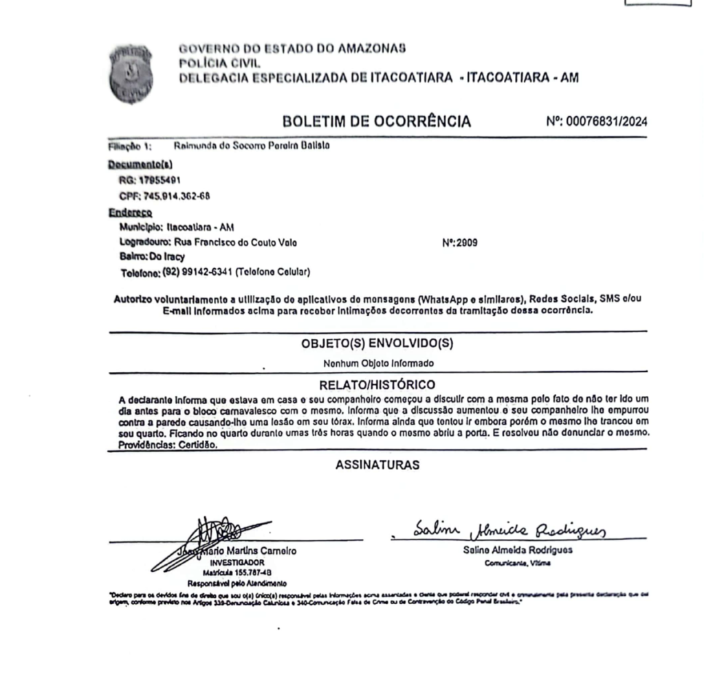 Vereador, braço direito de Mário Abrahim em Itacoatiara, pode ser cassado, acusado de agredir sua esposa; veja documento