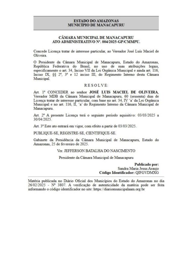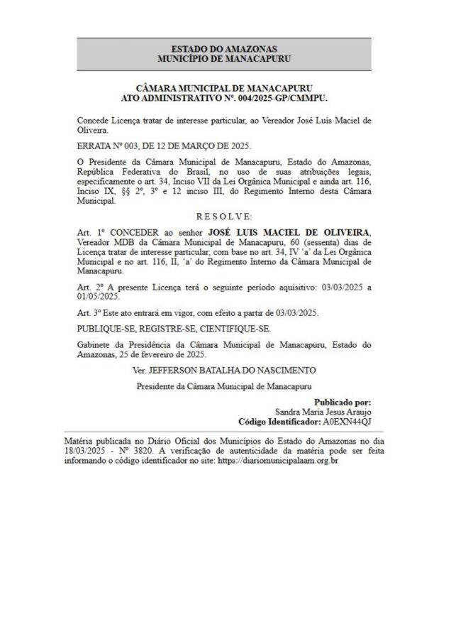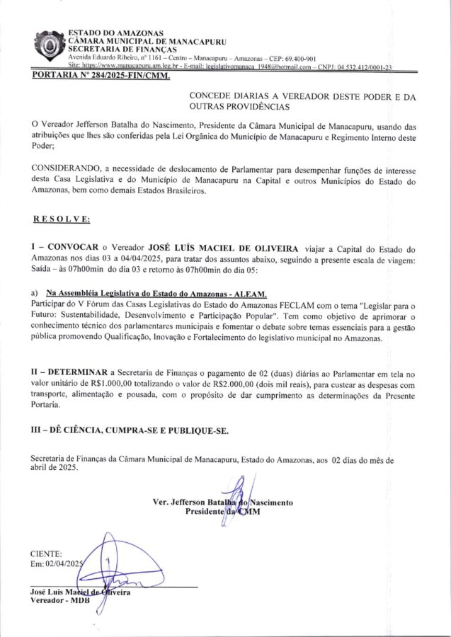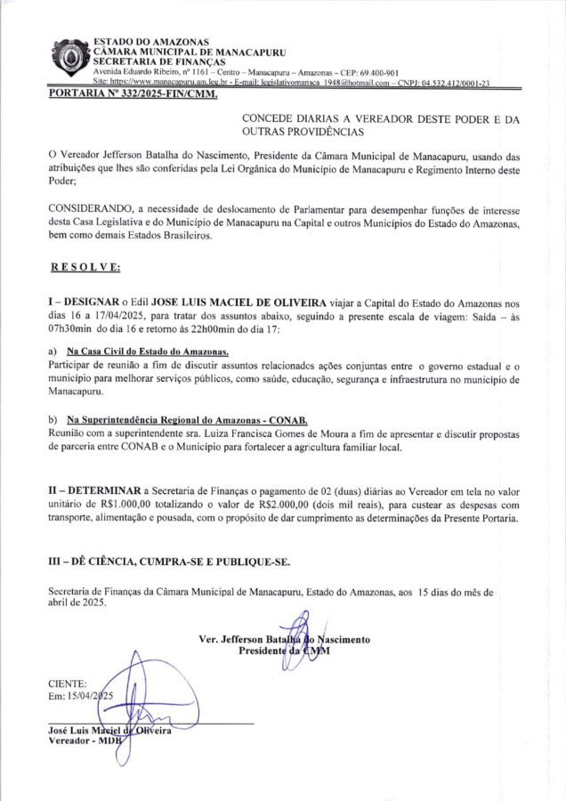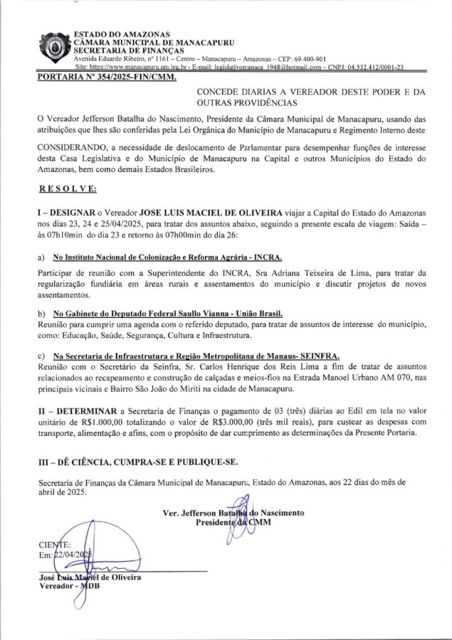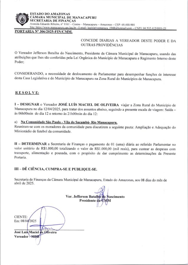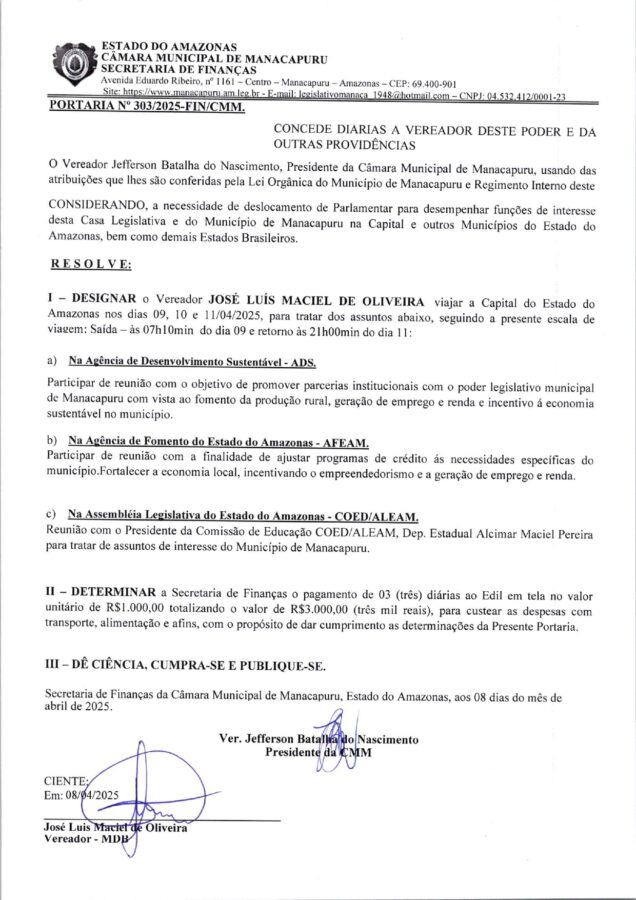 Amazonas – Uma denúncia protocolada em órgãos de controle aponta que o vereador José Luís Maciel de Oliveira, da Câmara Municipal de Manacapuru (AM), teria recebido R$ 11 mil em diárias no período em que estava oficialmente afastado do cargo para tratar de assuntos particulares.