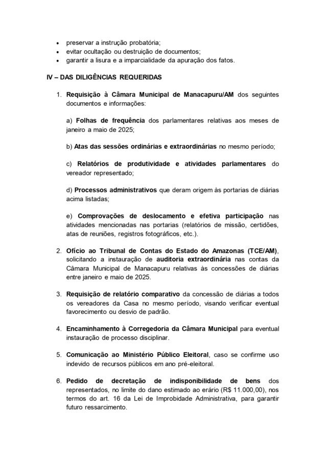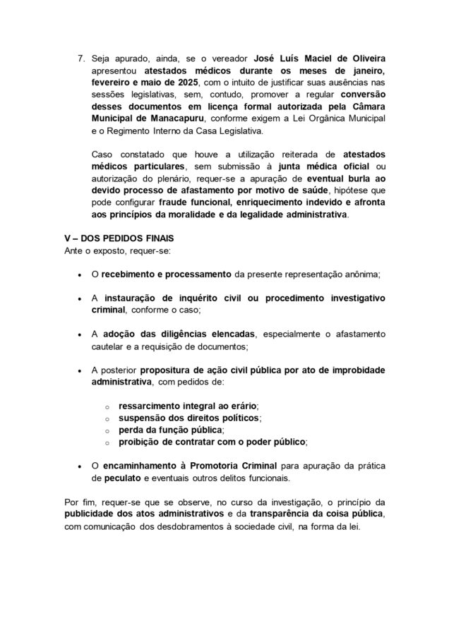 Os autores da denúncia pedem ainda que todas as apurações ocorram de forma transparente e com ampla publicidade, a fim de garantir o interesse público e o controle social sobre a conduta dos agentes políticos envolvidos.