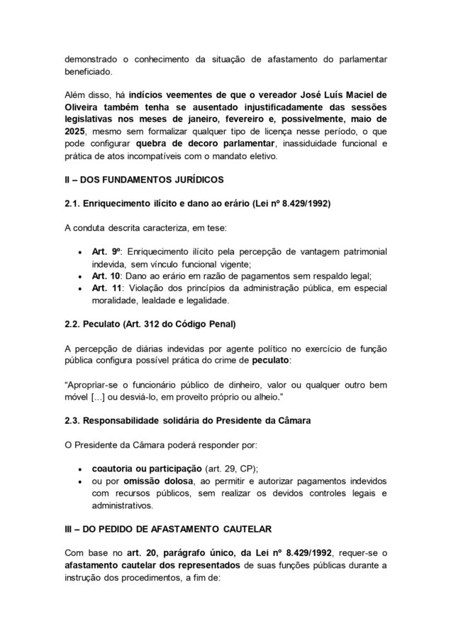 Com base na Lei de Improbidade Administrativa (Lei nº 8.429/1992), o documento denuncia possíveis práticas de enriquecimento ilícito, prejuízo aos cofres públicos e desrespeito aos princípios que regem a administração pública. Também é levantada a possibilidade de crime de peculato, previsto no artigo 312 do Código Penal, cuja pena pode chegar a 12 anos de reclusão.