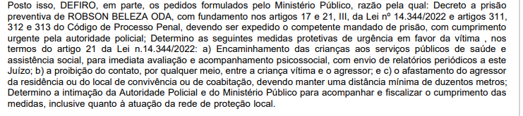 Além da prisão, a Justiça determinou medidas protetivas para proteger a criança, incluindo a proibição de contato entre o agressor e a vítima, com uma distância mínima de 200 metros, e o afastamento de Robson Beleza da residência onde convivia com o menor. O juiz Túlio de Oliveira Coutinho também ordenou a avaliação psicossocial imediata da criança pelos serviços de saúde e assistência social, com acompanhamento periódico.