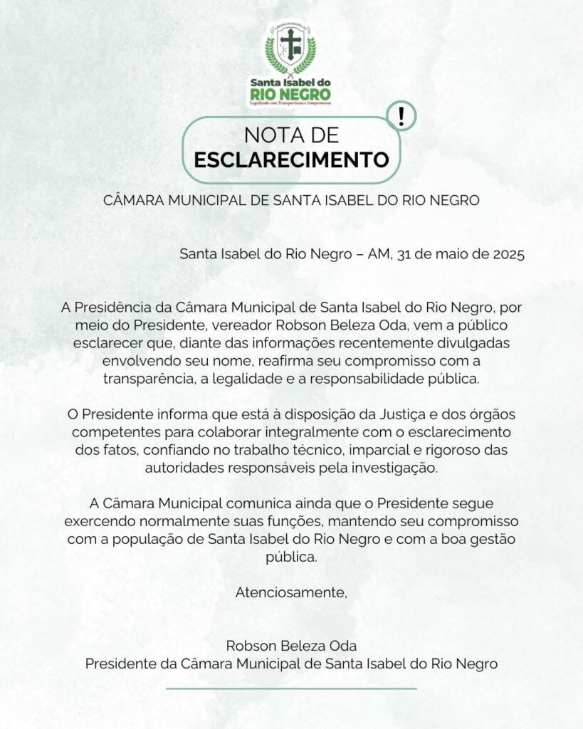 Em nota publicada nas redes sociais da Câmara Municipal no domingo, Robson Beleza afirmou estar à disposição da Justiça e confiante no trabalho das autoridades. Antes do pedido de prisão ser expedido, ele declarou que seguia exercendo suas funções normalmente. O vereador é sobrinho do prefeito de Santa Isabel do Rio Negro, José Beleza (União Brasil), que até o momento não se pronunciou sobre o caso.