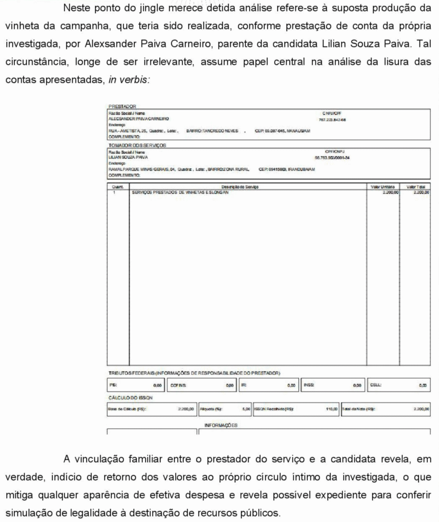 Além disso, a prestação de contas da candidata é apontada como inconsistente. Embora Lilian tenha afirmado em audiência ter recebido R$ 5.000,00 e contratado de 9 a 10 pessoas , os registros financeiros não mostram despesas com a contratação de pessoal. Um pagamento de R$ 2.200,00 por “vinhetas e slogan” foi feito a um parente da candidata, Alecsander Paiva Carneiro , o que a acusação vê como indício de simulação para justificar o uso de recursos.