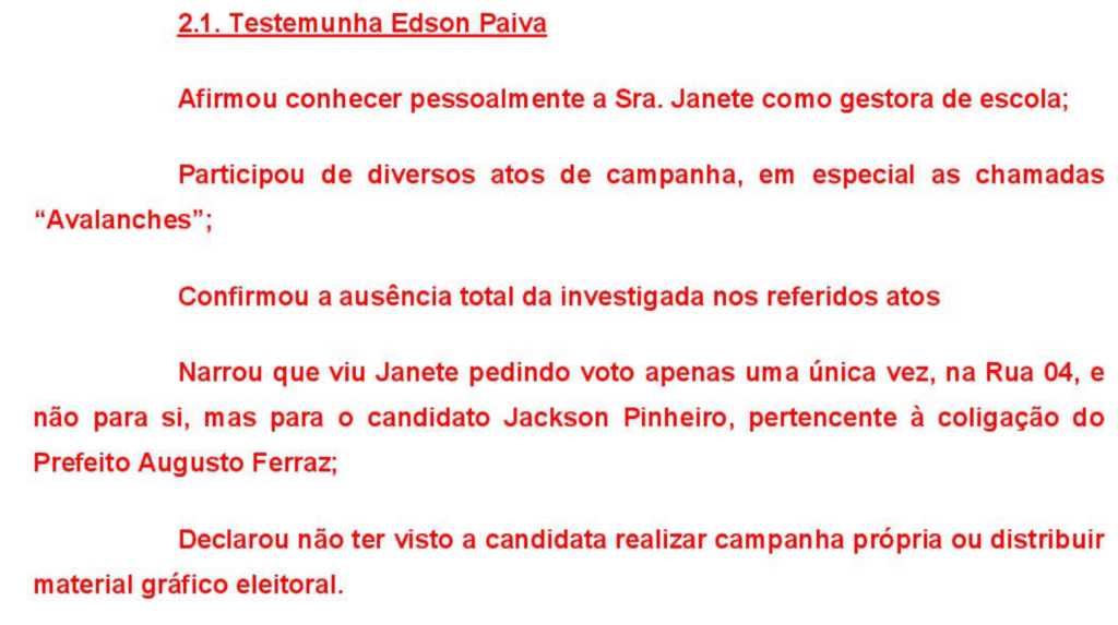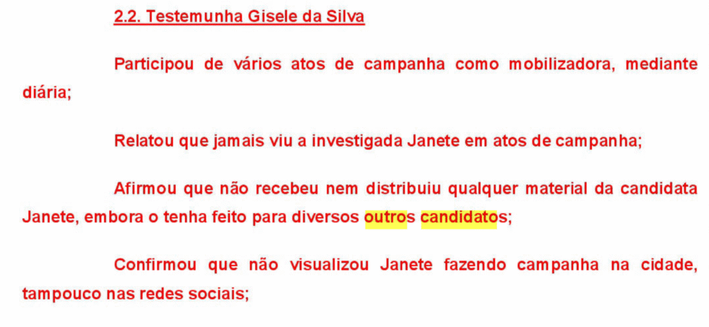A petição alega uma “inércia absoluta” da candidata. Testemunhas que participaram ativamente da campanha, como Edson Paiva e Gisele da Silva, relataram que jamais viram Janete em atos de campanha ou distribuindo material.
