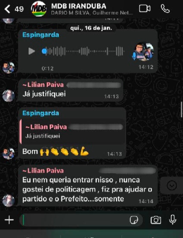 A prova central anexada ao processo é uma mensagem de Lilian Paiva em um grupo de WhatsApp do MDB Iranduba , onde ela teria afirmado: “Eu nem queria entrar nisso, nunca gostei de politicagem, fiz pra ajudar o partido…” .