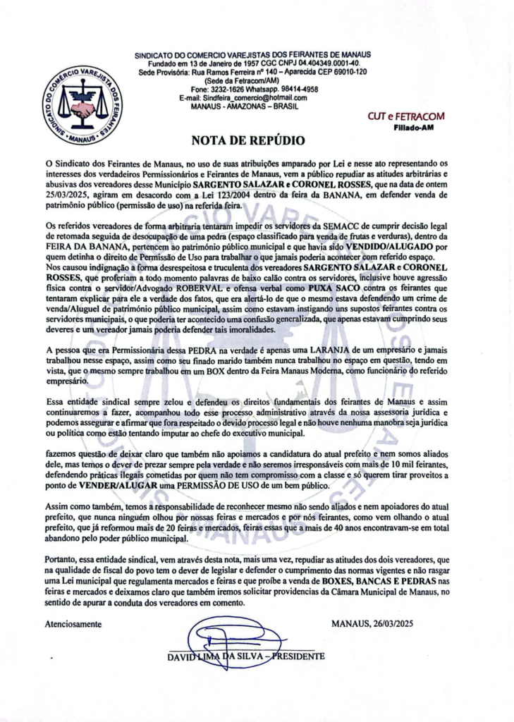 O Sindicato dos Feirantes de Manaus repudiou veementemente as atitudes dos parlamentares e anunciou que solicitará providências da Câmara Municipal de Manaus. A entidade destacou ainda que, embora não tenha vínculos políticos com a atual gestão municipal, reconhece que nunca houve tanto investimento na reestruturação das feiras e mercados. Segundo a nota, enquanto o Executivo trabalha para organizar o setor, vereadores como Salazar e Rosses atuam como defensores da ilegalidade e do caos.
