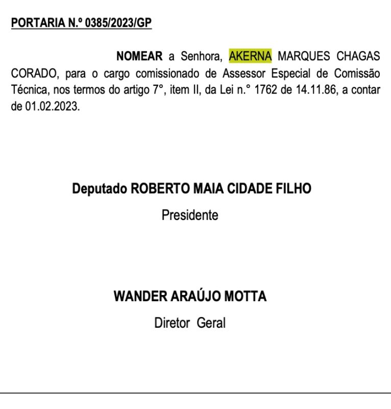 Em fevereiro de 2023, Akerna, não satisfeita em receber apenas R$30 mil por mês da PC-AM, conseguiu um cargo maravilhoso na Aleam. Ela foi nomeada pelo presidente da Casa, deputado Roberto Cidade, para o cargo de “Assessor Especial de Comissão Técnica”, após suposta indicação da deputada estadual Alessandra Câmpelo, que seria sua madrinha política.
