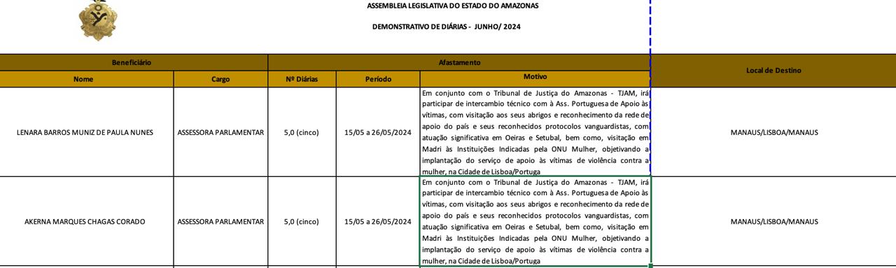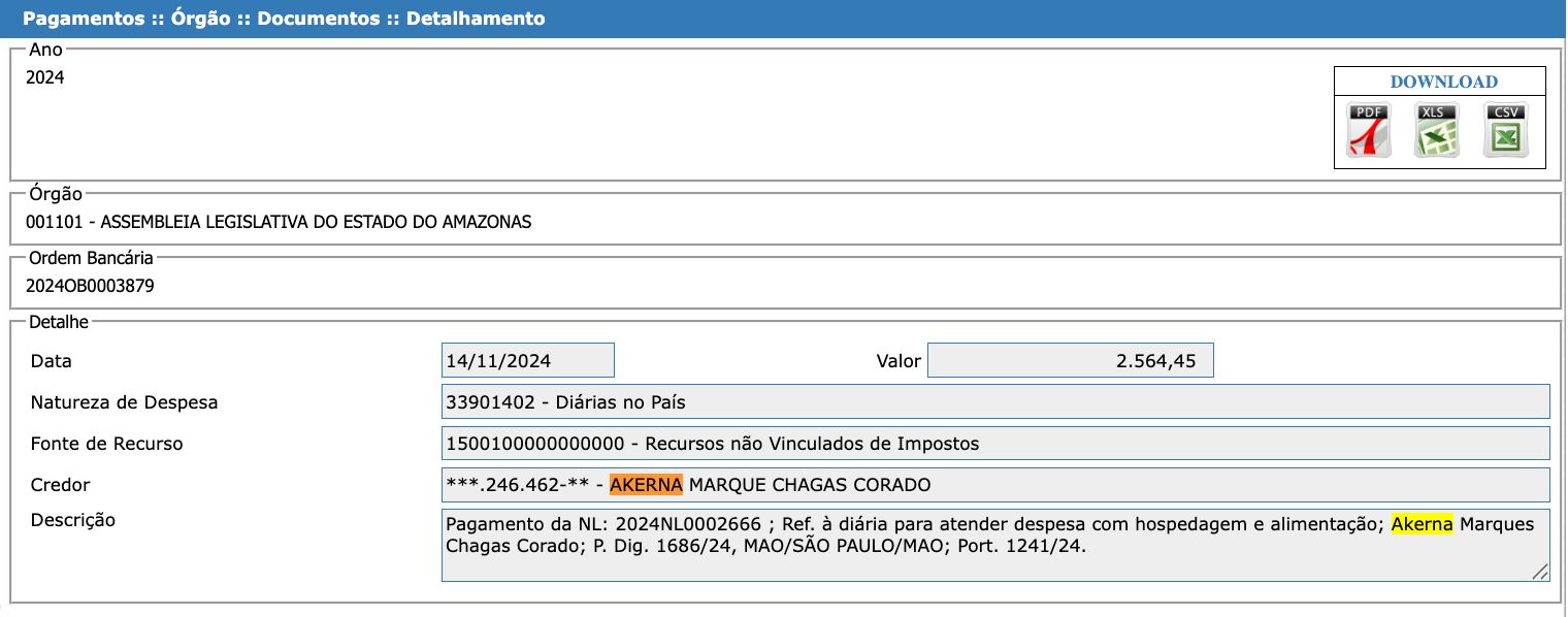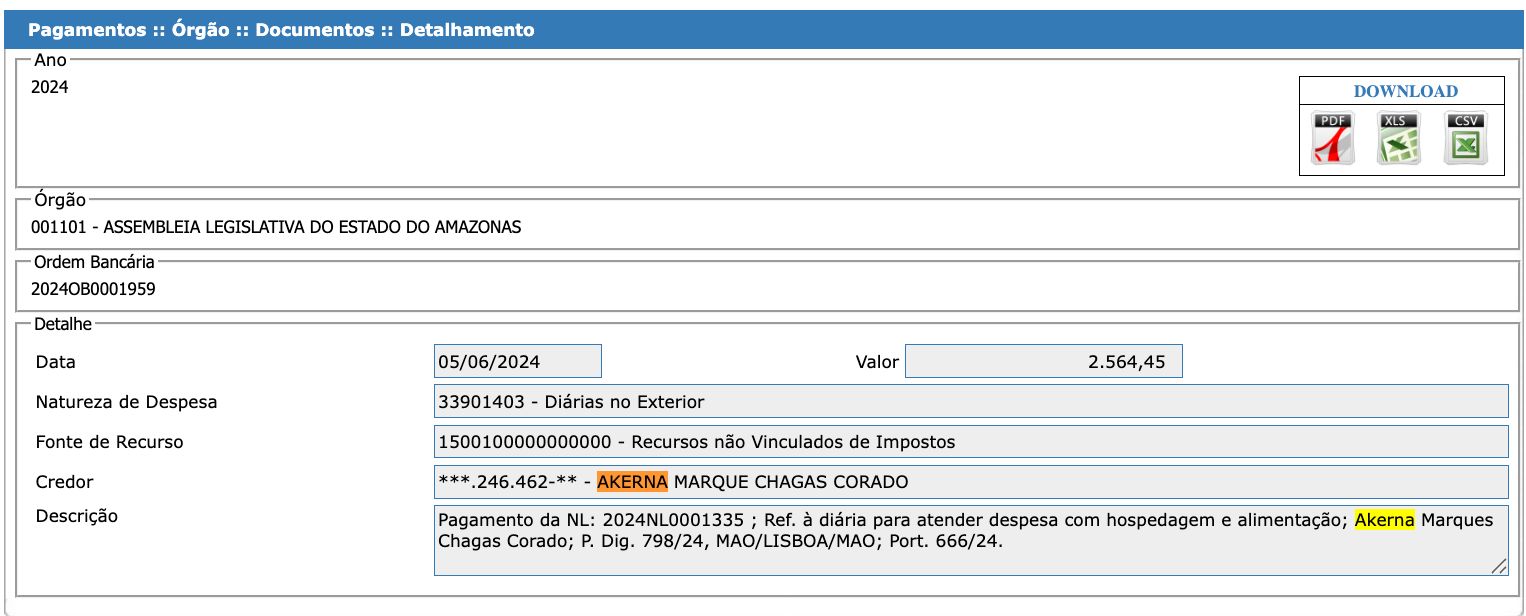 O que também consta no Portal da Transparência da Aleam são as viagens de Akerna que foram custeadas com o dinheiro do povo. Em maio de 2024, Akerna viajou para Lisboa, Portugal, acompanhando a deputada Alessandra Câmpelo. Os registros da Transparência mostram que a Aleam pagou R$ 2.564,45 em diárias e alimentação para manter Akerna no exterior, tudo isso pago com dinheiro público.