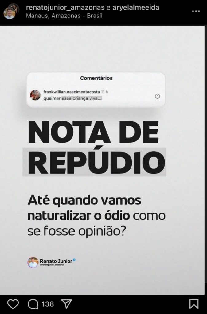 Manaus – O vice-prefeito de Manaus, Renato Júnior, emitiu uma nota de repúdio nesta sexta-feira santa (17) após as graves ameaças direcionadas à pequena Helena, neta do prefeito David Almeida e filha de Fernanda Aryel. Em um momento que simboliza o amor e a compaixão de Cristo, nem mesmo uma criança foi poupada da maldade nas redes sociais.