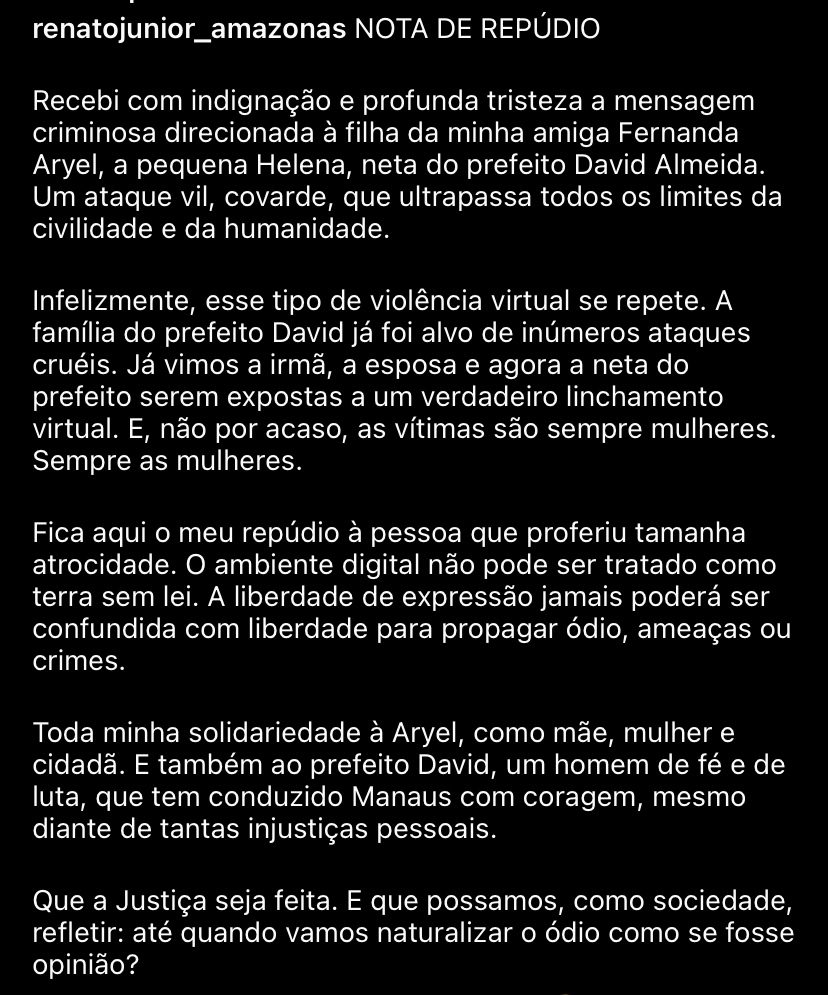 Vice-prefeito, Renato Júnior, repudia ameaças à neta de David Almeida: “Nem uma criança foi poupada!”