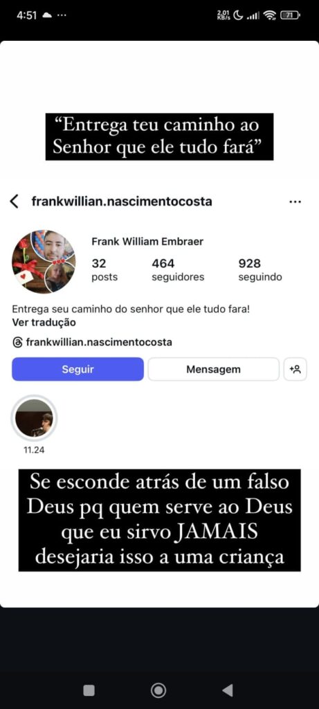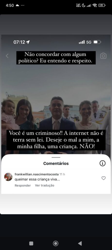 As ameaças foram feitas por um perfil identificado como Frank William Embraer, que publicou mensagens com teor extremamente violento, como “queimar essa criança viva”. A mãe da criança, Fernanda Aryel, reagiu imediatamente e repudiou as ameaças. “Respeito quem pensa diferente, mas desejar morte a uma criança é inadmissível”, declarou, reforçando que não aceitará ataques à sua família.