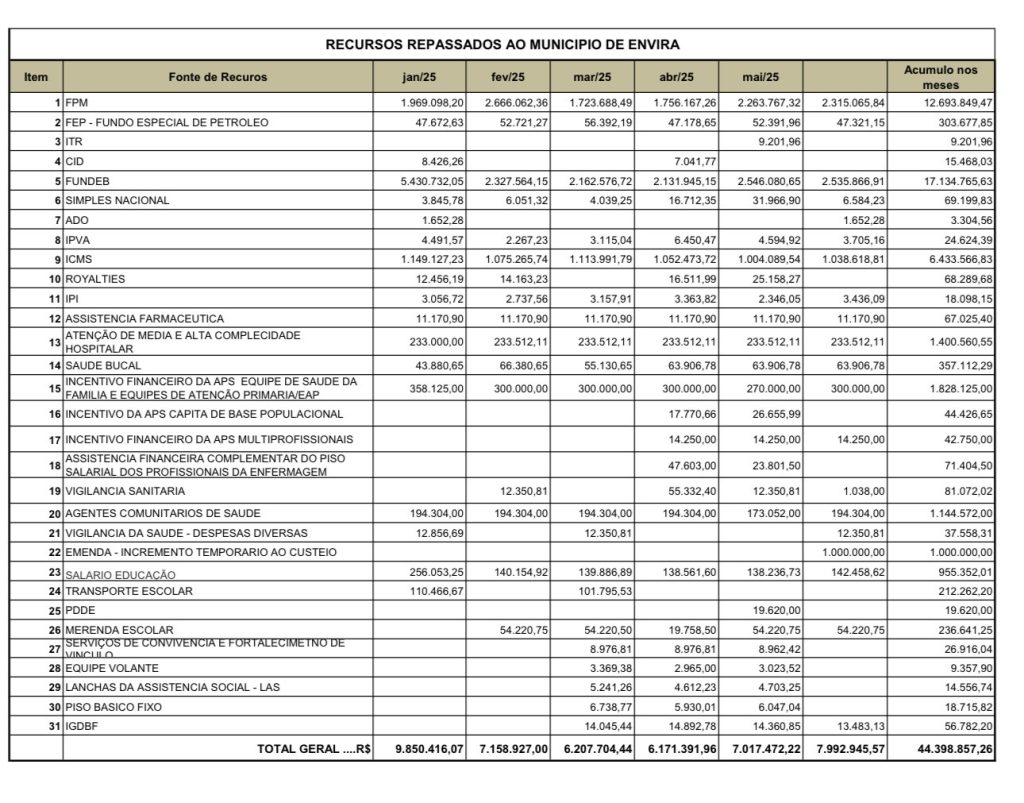 Apesar da situação alarmante, o Portal da Transparência revela que a Prefeitura de Envira já arrecadou quase R$ 45 milhões apenas no primeiro semestre de 2025. No entanto, a aplicação desses recursos é uma incógnita: nenhuma obra pública está em andamento, os serviços básicos estão comprometidos e há denúncias de que a prefeitura opera com o mínimo de servidores.