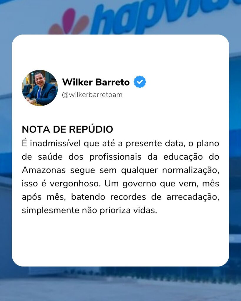 Amazonas – O deputado estadual Wilker Barreto emitiu nesta terça-feira (3) uma nota de repúdio contra o Governo do Estado do Amazonas, denunciando o que classifica como “descaso inaceitável” com a saúde dos profissionais da educação. Na manifestação, o parlamentar critica duramente a falta de providências do Executivo em relação à situação do plano de saúde da categoria, que segue inoperante, afetando milhares de servidores da rede estadual de ensino.