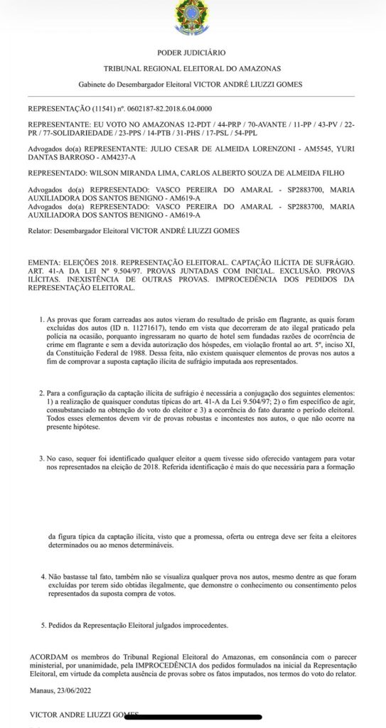 Manaus – O TRE-AM (Tribunal Regional Eleitoral do Amazonas) arquivou ação do pré-candidato Amazonino Mendes (Cidadania) contra o governador Wilson Lima (União Brasil), por compra de votos. O juiz Victor André Liuzzi Gomes, relator da ação, considerou falta de provas. O parecer foi acatado pelo plenário.