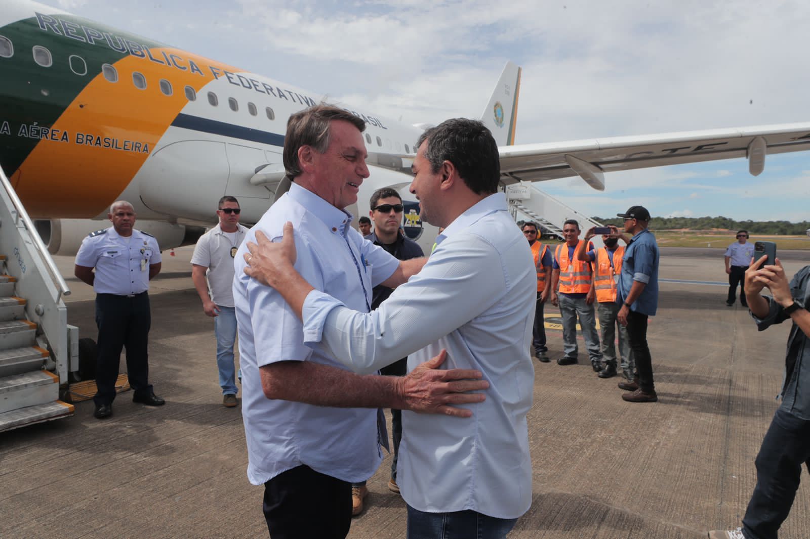 Manaus — O governador Wilson Lima recebeu, neste sábado (28), o presidente da República, Jair Messias Bolsonaro, que desembarcou no Aeroporto Internacional Eduardo Gomes, em Manaus, pela manhã.