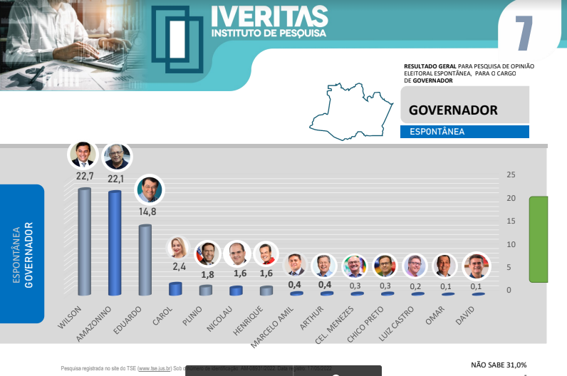 Amazonas – Pesquisa eleitoral espontânea do Instituto Iveritas divulgada nesta segunda-feira (6) mostra o governador Wilson Lima (União Brasil) ultrapassando o ex-governador Amazonino Mendes (Cidadania).