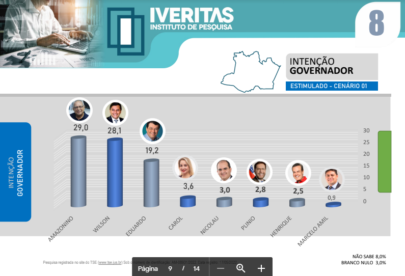 Os dados, divulgados pelo levantamento da pesquisa espontânea apontam Wilson Lima com 22,7% das intenções de votos, enquanto o adversário surge com 22,1% da preferência do eleitorado, seguido do senador Eduardo Braga (MDB) com 14,8%.