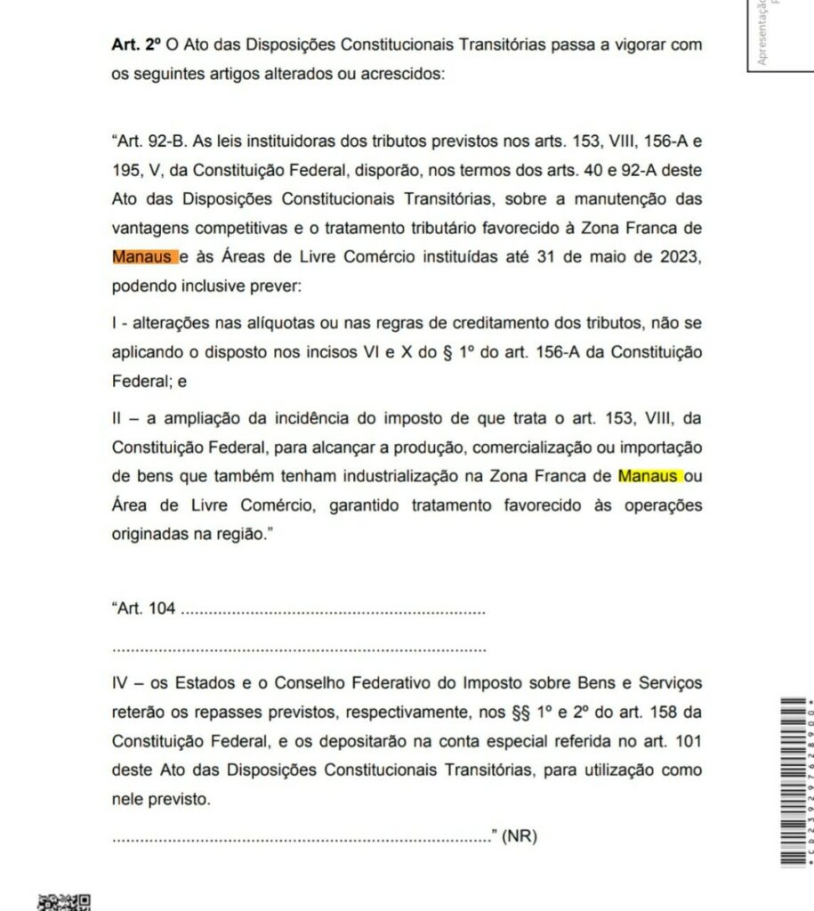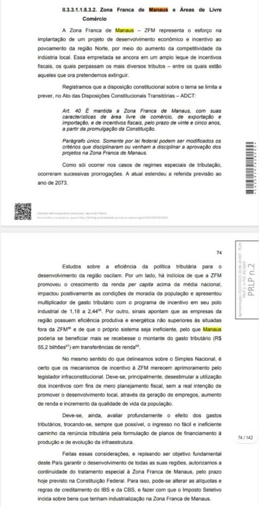 O relator da Reforma Tributária, deputado Aguinaldo Ribeiro (PP-PB), anunciou que incluirá em seu relatório mudanças relacionadas à Zona Franca de Manaus, bem como demandas dos municípios. Esses acordos foram fechados em caráter emergencial com a bancada amazonense e, por essa razão, não constam do texto inicial.