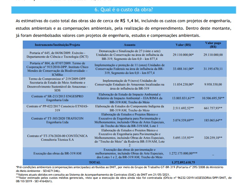 BR-319: relatório do DNIT revela que obras de pavimentação do trecho do meio irão custar R$ 1,4 bilhão