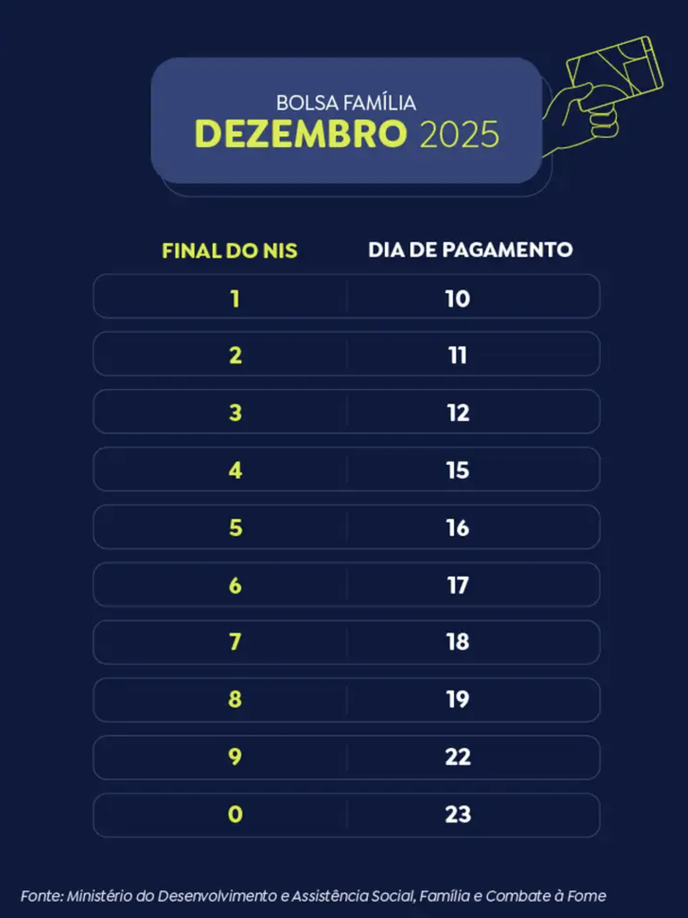 No modelo tradicional do Bolsa Família, o pagamento ocorre nos últimos dez dias úteis de cada mês. No entanto, por causa das festas de fim de ano, o calendário de dezembro é antecipado em cerca de dez dias, para dar tempo de os benefícios serem depositados antes do Natal.