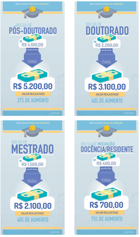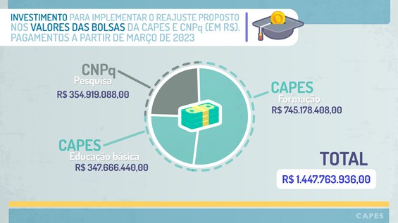 A CAPES terá um aporte orçamentário de R$745,2 milhões para atualizar os valores dos benefícios da pós-graduação e R$ 347,6 milhões para os programas de formação de professores. No CNPq, o adicional é de R$ 354,9 milhões. O investimento para implementar o reajuste totaliza mais de R$ 1,4 bilhão.