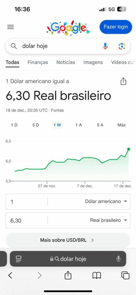 Brasil – O dólar fechou em forte alta nesta quarta-feira (18), atingindo um novo recorde a R$ 6,30. A moeda já vem em ritmo de alta nos últimos dias, renovando os recordes sucessivamente. Ontem, a divisa fechou com avanço de 0,04%, encerrando a sessão a R$ 6,0961, após oscilar entre R$ 6,0581 e R$ 6,2073 durante o dia.