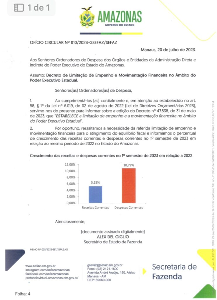 Segundo o art. 58. § 1º da Lei nº 6.019, de 02 de agosto de 2022, que trata das Diretrizes Orçamentárias para o ano de 2023, o Estado do Amazonas busca garantir a estabilidade financeira através da contenção de gastos públicos. O documento foi assinado digitalmente pelo Secretário de Estado da Fazenda, ALEX DEL GIGLIO.