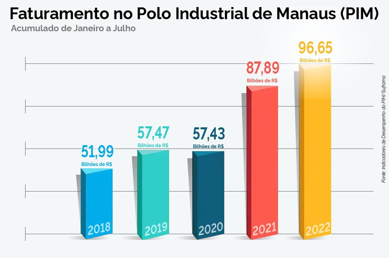 Manaus – O Polo Industrial de Manaus (PIM) faturou R$ 96,66 bilhões entre janeiro e julho de 2022, o que indica aumento de 9,97% na comparação com igual intervalo do ano passado (R$ 87,9 bilhões). Em dólar, o faturamento também alcançou crescimento, este de 16,86%, na comparação entre os sete primeiros meses de 2022 (US$ 19.28 bilhões) com o mesmo período de 2021 (US$ 16.5 bilhões).