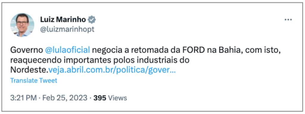Agora, dois anos depois, Marinho afirmou que está empenhado em retomar a produção de veículos em Camaçari, na região metropolitana de Salvador, e divulgou a notícia em sua conta no Twitter, incluindo um link para uma reportagem da revista Veja sobre as negociações do governo federal com investidores chineses para viabilizar a volta da multinacional norte-americana ao Brasil.