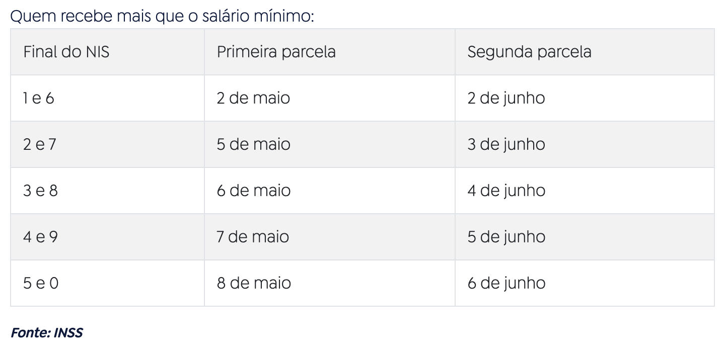 Com a previsão de injetar R$ 73,3 bilhões na economia, a antecipação do décimo terceiro do INSS foi programada para ser paga em duas parcelas. A primeira parcela foi paga de 24 de abril a 8 de maio.