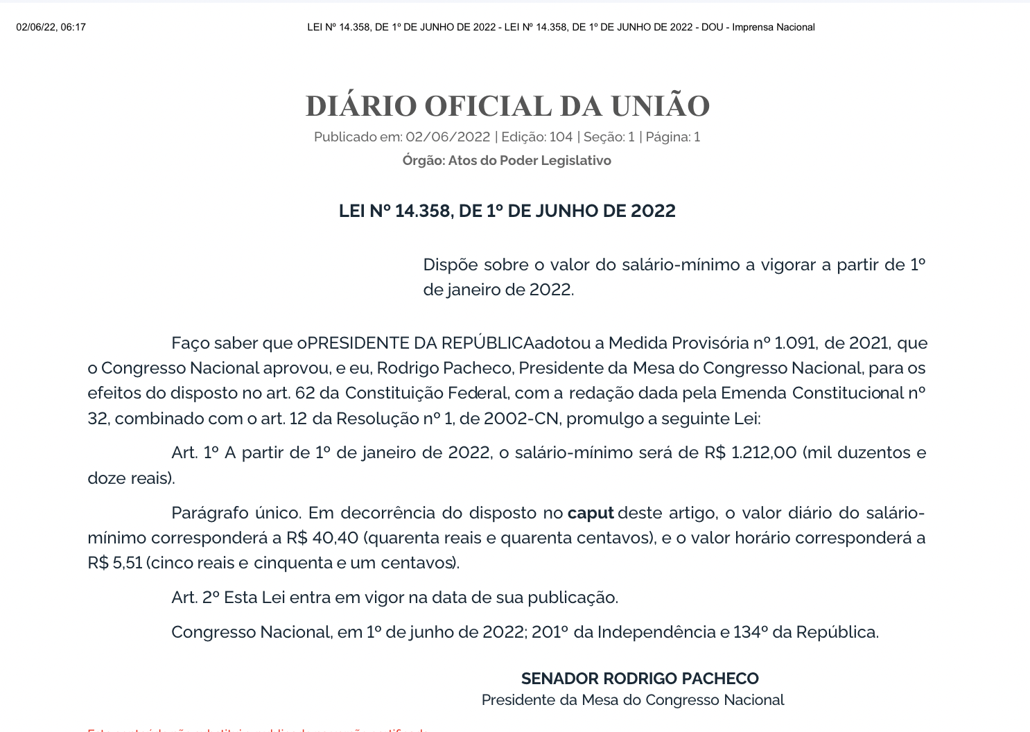 Brasil – Depois de a Câmara dos Deputados e o Senado Federal terem aprovado a Medida Provisória 1091/2021, que fixa o salário mínimo mensal em R$ 1.212 para o ano de 2022, a lei foi promulgada e publicada no Diário Oficial da União desta quarta-feira (2/6).