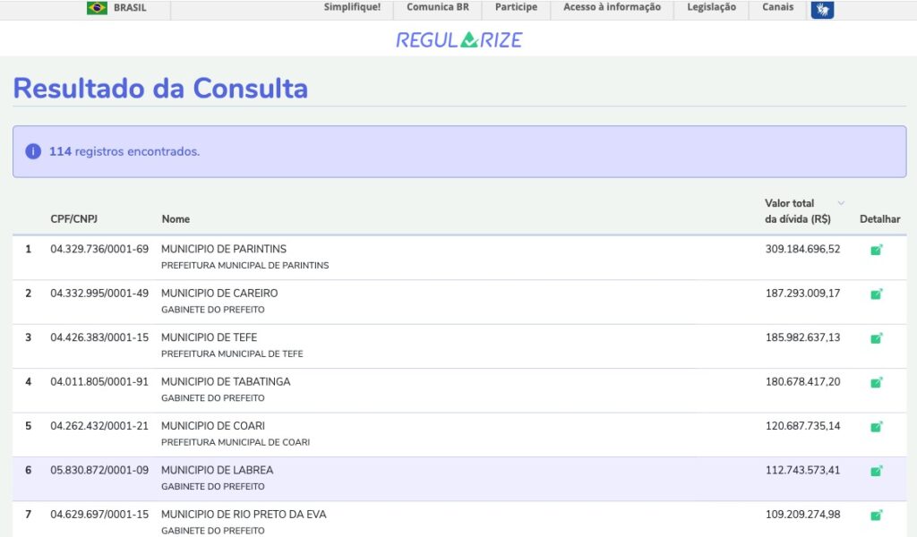 O município de Parintins tem registro de R$ 705.079,83 de débitos tributários, R$ 308.097.094,23 de previdenciários e R$ 382.522,46 de multa trabalhista. No Painel das Negociações da PGFN não há informações sobre negociações para pagamento. A Lista de Devedores está regulamentada pela Portaria PGFN n. 636, de 9 de janeiro de 2020, e alterações posteriores.