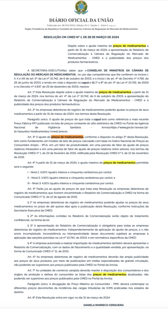Brasil – A notícia que impacta diretamente milhões de brasileiros foi oficializada pela Câmara de Regulação do Mercado de Medicamentos (CMED): os preços dos medicamentos sofrerão um reajuste máximo de 4,5%. A resolução, divulgada nesta sexta-feira, 29, e publicada no Diário Oficial da União (DOU), autoriza as empresas produtoras a realizarem os ajustes a partir deste domingo, 31.