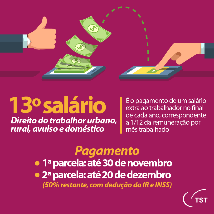 O salário extra, também conhecido como abono natalino, é um direito assegurado pela CLT (Consolidação das Leis Trabalhistas), e que também está previsto no artigo 7º da Constituição Federal. Segundo a legislação, a primeira parcela do 13º deve ser paga entre 1º de fevereiro e 30 de novembro, e a segunda, até o dia 20 de dezembro. A partir de 15 dias trabalhados, o empregado já tem direito a receber o abono, que também é pago quando se encerra o contrato de trabalho.