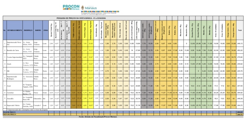 Manaus – Segundo dados divulgados pelo Serviço de Atendimento e Proteção ao Consumidor (Procon Manaus), o Vitória Supermercados se destacou como a opção mais econômica para a compra da cesta básica na cidade. A pesquisa realizada entre os dias 1º e 3 de abril comparou os preços dos alimentos que compõem a cesta básica em diferentes estabelecimentos, visando fornecer informações que ajudem a população a potencializar o seu poder de compra.