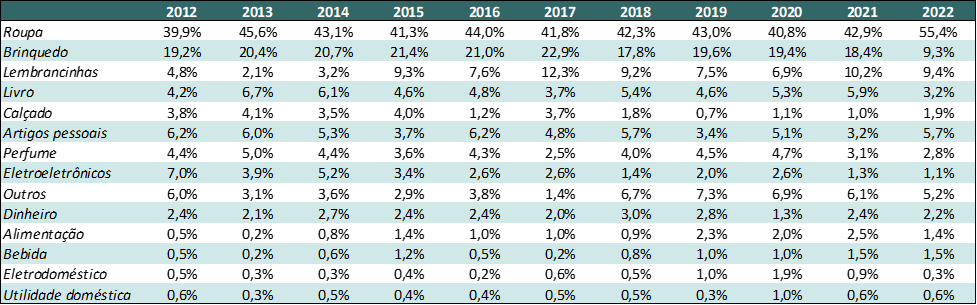 O item preferido da lista de Natal continua sendo roupas, com um aumento expressivo de 44,2% para 55,4% nas intenções de compras embora os preços dos produtos do vestuário tenham subido acima de 10% nos últimos 12 meses. Essa variação das roupas foi superior a inflação média de 4,5% mas há uma variedade maior de itens com níveis de preços diversos, o que permite adequar a demanda de cada consumidor. Ao contrário, a intenção de compras de brinquedos caiu pela metade de 18,4% para 9,3%, assim como as roupas, os preços subiram acima da média da inflação (5,5%), mas o nível de preços tende a ter um ticket médio maior, por isso talvez tenha se reduzido na preferência dos consumidores.