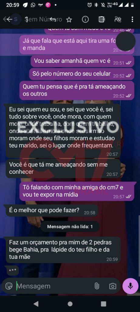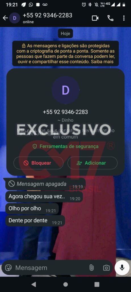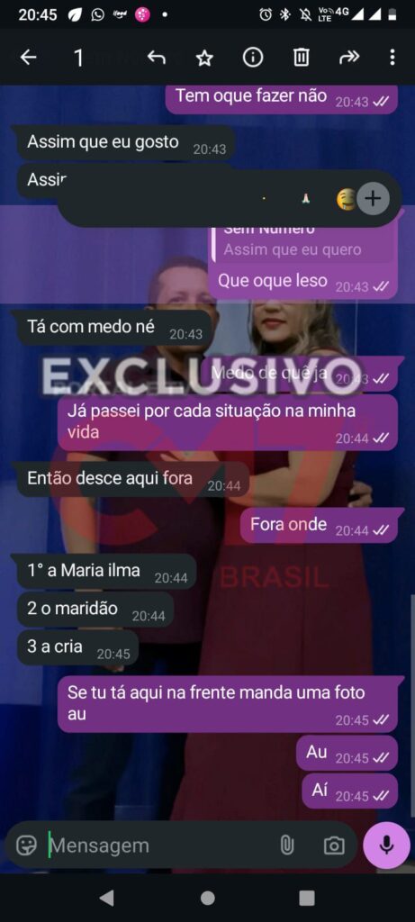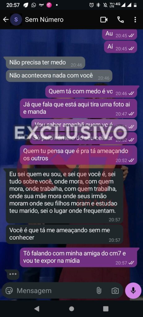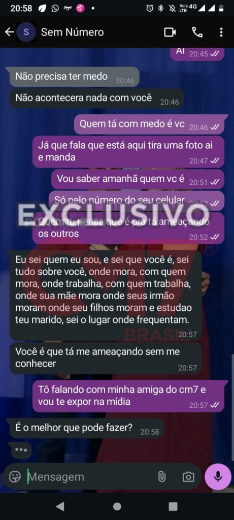 As conversas via WhatsApp, às quais a reportagem teve acesso, mostram um histórico preocupante de ameaças diretas e indiretas. Em um dos trechos, o agressor afirma saber detalhes da rotina da vítima e dos entes próximos, além de sugerir ações violentas. Em outro momento, ele afirma que vai oferecer drogas para que alguém agrida a mulher. “Amanhã vou colocar 1k de pedra pro primeiro que quebrar tua boca e teus dedos”, diz uma das mensagens ameaçadoras recebidas.
