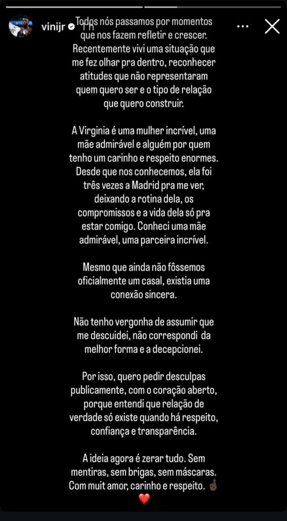 Brasil – O jogador Vini Jr. decidiu quebrar o silêncio e se manifestar sobre o fim do affair com Virginia Fonseca. Após a influenciadora confirmar o “término” na terça-feira (7), o craque do Real Madrid e da Seleção Brasileira abriu o coração na noite desta quarta (8), por meio de um texto publicado em suas redes sociais.