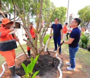 Prefeito David Almeida e vice Renato Junior realizam plantio de oliveiras na fase final do restauro da praça dos Remédios