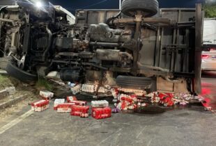 Caminhão com carregamento de cerveja tomba durante acidente no Coroado; veja vídeos