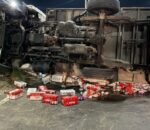 Caminhão com carregamento de cerveja tomba durante acidente no Coroado; veja vídeos
